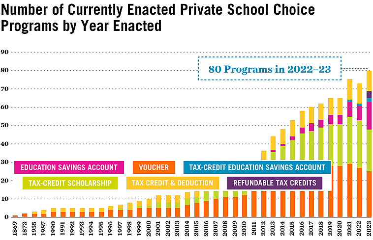 School choice reforms are spreading across the nation. Governments in 33 states are now providing financial support for private schooling through 80 different programs, as shown in this figure from EdChoice. About one million students are benefiting from these reforms.