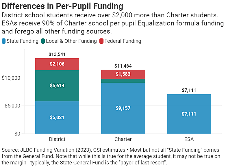 In Arizona, the average per‐pupil ESA funding is $9,785, but if the type of student in the ESA program was the same as the average student in public schools, it would be $7,111. That figure compares to $13,541 for average public school costs in the state.